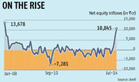 In July, mutual fund managers received Rs 108.45 billion from investors, the most in a month since January 2008. This was also when the BSE Sensex had risen as much as 50 per cent to 21,000 in a year.