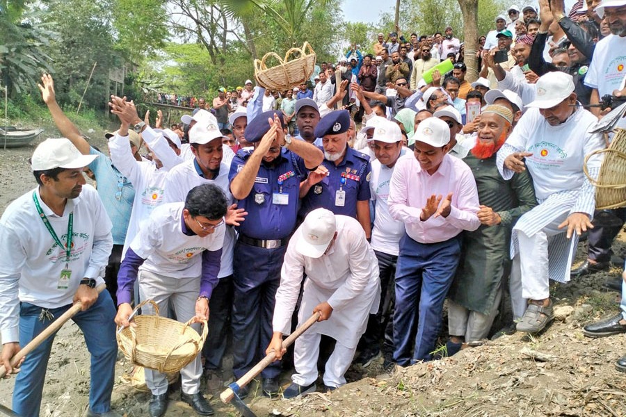Information and Broadcasting Minister Zahir Uddin Swapan inaugurates the canal excavation programme by cutting soil with a spade in Gournadi upazila of Barishal on Monday. — Focus Bangla