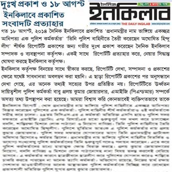 The Daily Inqilab has retracted its libelous report on a senior police officer and apologised for carrying it. In a notice published on its website on Sunday, Inqilab admitted that it did not maintain ‘adequate cautions’ in writing, editing and publishing the report on acting Additional Inspector General (AIG) of Police Pralay Kumar Joardar. The Bangla language newspaper made several allegations besides accusing Joardar of creating an ‘unofficial Hindu League’ in police force in the report titled ‘Police officer uses PM’s name to dominate force’ published on Aug 18. Joardar filed a case with Wari Police Station against the Inqilab’s editor, publisher, chief reporter, city editor and the correspondent who wrote the story. In the notice, Inqilab said it found in investigation that many of the information in the report were not based on facts. It admitted the report presented ‘untrue’ statements on the police officer. ‘We believe it has not been prudent to publish such a report involving him (Joardar) personally and the responsible police force,’ the notice read. The newspaper said ‘sorry’ for using words that hurt religious sentiment of a certain community. Earlier on January 18, the Inqilab had apologised after it was sued for publishing a report captioned ‘Indian force’s assistance to joint forces’ operation in Satkhira, according to bdnews24.com.
