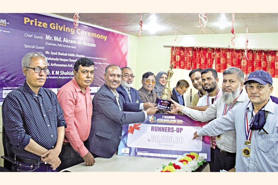 Players of Sonali Bank Limited receiving prize money of Tk 50,000 as the team became runners-up in the Inter-Bank Chess Tournament- 2022, organised by Bangladesh Chess Federation at the Chess Federation Hall Room of the National Sports Council in the city recently. Deputy Managing Director of Sonali Bank Limited Md. Mazibur Rahman receiving the trophy on behalf of the bank from chief guest Md. Akram-Al-Hossain, former Senior Secretary and Chairman of Palli Sanchay Bank
