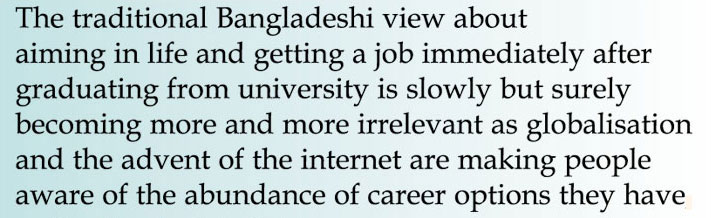 Also, the global recession as well as the job market are forcing people not to have any aim in life and instead keep all their options open once they graduate. Fahim Shahriar, a student at the University of Dhaka, told the writer in this regard, "People are not thinking of a concrete aim in life at this particular moment, as you never know which occupation will be in demand a few years from now due to the changing conditions in the job market with the global financial ramifications as well as the advent of technology. Hence, being better equipped with skills rather than having a hard and fast aim in life is the new norm."
