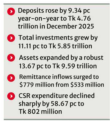 Islamic banks also strengthened their balance sheets, with total assets climbing to Tk 9.59 trillion in December 2025 from Tk 8.43 trillion in December 2024, marking a robust 13.67 per cent growth.