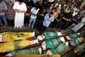 GAZA CITY, July 19 (agencies): Israeli air strikes and shelling killed more than 25 people across Gaza Saturday, among them children, raising the toll in 12 days of violence to 337, medics said.