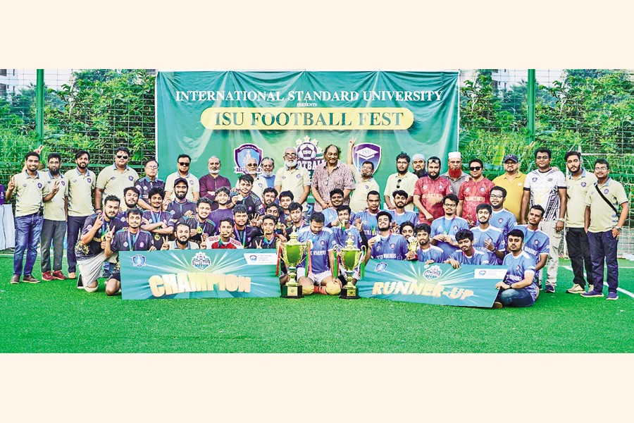 Players of champions Binary Blasters and runners-up Textile Warriors pose with the trophy of the ISU Football Fest Season 1 at the Royal Multisport Arena in the city on Monday. The tournament was organised by the International Standard University (ISU) Sports Club. ISU Vice Chancellor Professor Dr. Abdul Awal Khan and National football legend Kaiser Hamid handed over the trophies to the champion and runners-up teams. In a thrilling contest, the Binary Blasters, representing the Department of Computer Science and Engineering, clinched the title by defeating the Textile Warriors from the Department of Textile Engineering with a 2-1 victory