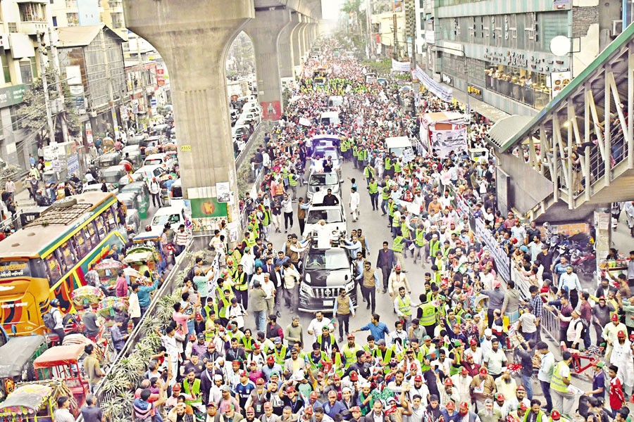 Jamaat-e-Islami brings out a procession for its election campaign, led by party Ameer Dr Shafiqur Rahman, at Mirpur in the capital on Monday. — FE Photo