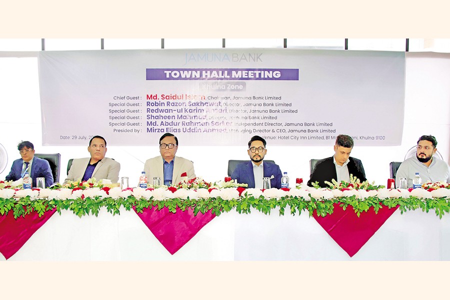 Jamuna Bank Limited organised a town hall meeting of Khulna Zone in Khulna, aiming to enhance augmented customer service and expand banking services with due diligence. Md Saidul Islam, chairman of Jamuna Bank Limited, attended the event as the chief guest. Managing Director and CEO Mirza Elias Uddin Ahmed presided over the programme.