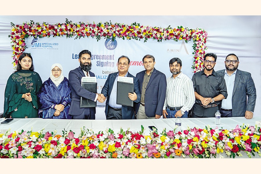 JMI Group will build a specialised hospital at Amin Trade Centre, a high-rise building at Dhanmondi in Dhaka. For this, the entire building has been rented by the JMI Specialised Hospital Limited. To this end, a lease signing ceremony was held on the second floor of the under-construction building recently. Founder and Managing Director of JMI Group Md Abdur Abdur Razzaq and Managing Director of Amin Mohammad Group Aminul Haque Nabil signed the agreement.