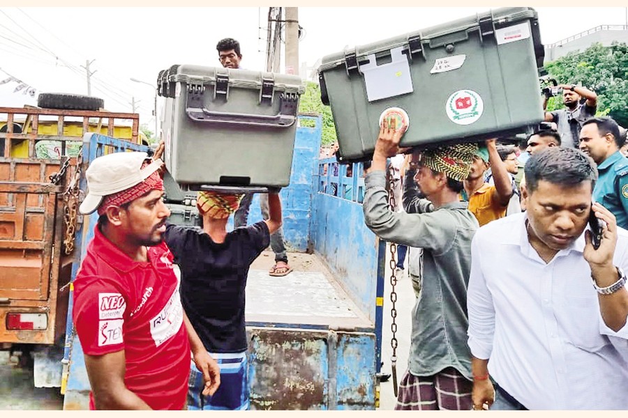 In Barishal, a total of 1500 Electronic Voting Machines (EVM) and other election materials reached 126 polling stations ahead of the election today.