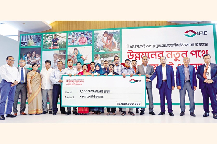 IFIC Bank distributed loans to 2500 CMSME entrepreneurs across the country through all its branches and sub-branches on Tuesday. On the occasion, an inaugural programme titled 'Glorious Journey of CMSME Loan Refinancing Scheme Distribution' was held at the IFIC Tower in Dhaka. Abdur Rouf Talukder, Governor of Bangladesh Bank, inaugurated the event as the chief guest while ARM Nazmus Sakib, Director of IFIC Bank, presided over it. Managing Director and Chief Executive of IFIC Bank Shah A Sarwar and Deputy Governor of Bangladesh Bank Abu Farah Md. Nasser were also present.