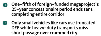 Analysts concerned also say the PPP model to construct, operate, manage and hand over the communications infrastructure to the government also takes a knock as the foreign private partner of the project earns revenue partially while ending one-fifth of the 25-year concessionaire period for failure to ready the entire 19.7-kilometre elevated and access-control highway across the capital city.