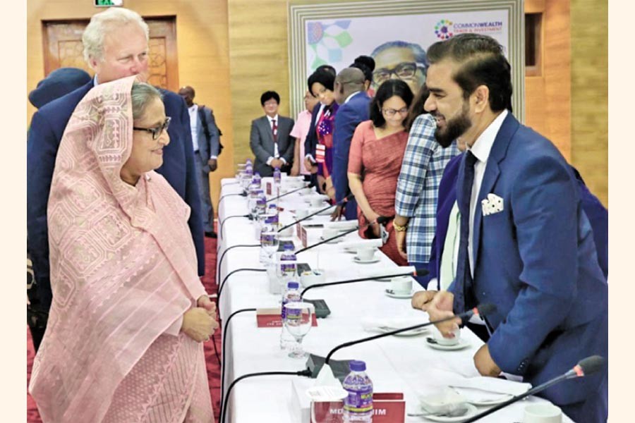 Chairman of the Minister-MyOne Group MA Razzak Khan Raj exchanges greetings with Prime Minister Sheikh Hasina at the Commonwealth Trade and Investment Forum-2023 at Bangabandhu International Conference Centre in the city on Wednesday. The Prime Minister inaugurated the two-day event.