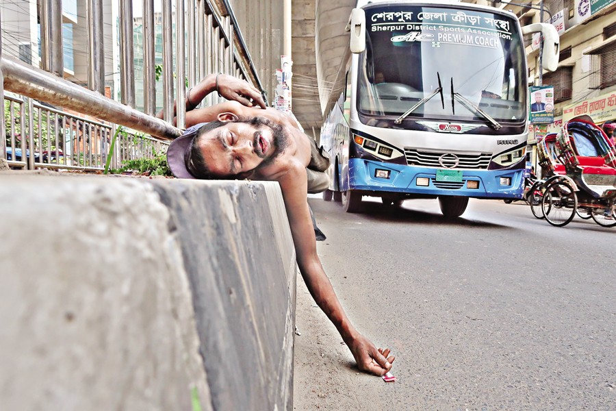 Many street children, homeless youths and slum dwellers are now addicted to glue sniffing, popularly known as Dandy, which causes a temporary sense of euphoria, dizziness or numbness. In the photo taken on Wednesday, a person, believed to be addicted to such inhalant substances, lies fast asleep on the central reservation in the Paltan area, with his arm jutting out dangerously onto the road, which may invite a fatal accident. — FE Photo by Shafiqul Alam