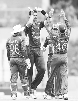 Wahab Riaz, one of the three left-arm seamers for Pakistan alongside Irfan and Junaid Khan, took three for 50.