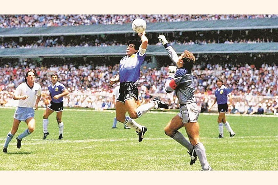 The goal that gave Argentina a 1-0 lead in the quarterfinal against England in Mexico City has become part of World Cup legend. Maradona jumped as if to head the ball but instead punched it past goalkeeper Peter Shilton. England players protested to Nasser but the goal stood. Maradona quipped afterward that it was scored "a little with the head of Maradona and a little with the hand of God," leading to its iconic name.