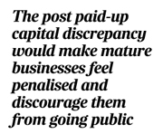 The post paid-up capital discrepancy would make mature businesses feel penalised and discourage them from going public, speakers said at the discussion.