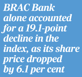 BRAC Bank alone accounted for a 19.1-point decline in the index, as its share price dropped by 6.1 per cent. Islami Bank followed, contributing a 7-point fall.