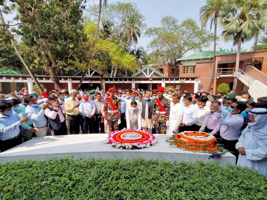 Md. Nazrul Islam, Secretary of Road Transport & Highways Division (RTHD) and Abdus Sabur, Chief Engineer of Roads & Highways Department (RHD) placing floral wreath at the tomb of Father of the Nation Bangabandhu Shiekh Mujibur Rahman at Tungipara in Gopalganj on Saturday — FE Photo
