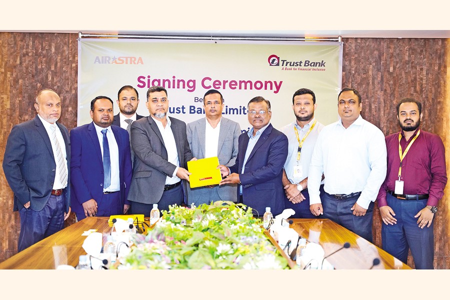 A memorandum of understanding was signed between Trust Bank Limited and Astra Airways Limited. Md Mostafa Musharrof, head of card division of Trust Bank, and Md Mozammel Haque Bhuiya, head of marketing of Astra Airways, signed the agreement. Ahsan Zaman Chowdhury, deputy managing director and CBO of Trust Bank, was present on the occasion. Under the deal, Trust Bank's debit and credit cardholders will be able to avail 10 per cent discount on base fare on domestic routes ticket purchases from Astra Airways.