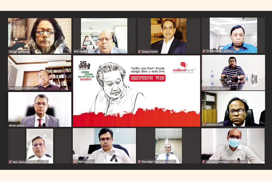 Midland Bank Ltd organised a virtual discussion on the life and works of Father of the Nation Bangabandhu Sheikh Mujibur Rahman, the marking National Mourning Day. Nilufer Zafarullah, Chairman of the bank joined the discussion as chief guest. Md Ahsan-uz Zaman, Managing Director & CEO, also joined it among others
