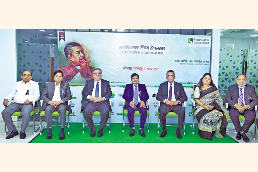 Modhumoti Bank Limited on Monday organised dua mahfil and discussion on the occasion of the 48th martyrdom anniversary of the Father of the Nation Bangabandhu Sheikh Mujibur Rahman and National Mourning Day at the bank's head office. A Mannan Khan, director of Modhumoti Bank; Md. Shafiul Azam, managing director & chief executive officer; Shahnawaj Chowdhury, deputy managing director & chief operating officer; and Kamrul Hasan Khan, deputy managing director & chief business officer, were present.