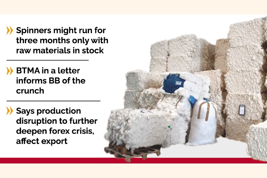 The BTMA in a letter, signed by its president Mohammad Ali Khokon, to the central bank on the day said they could not import the requisite raw materials like cotton, polyester staple fibre (PSF) and viscose staple fibre (VSF) to feed the readymade garment (RMG) exporters though they (textile millers) already received orders.