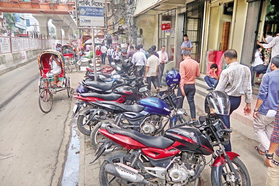 Motorbikes have been illegally parked right on the footpath, obstructing smooth movement of pedestrians. The photo was taken from Comrade Moni Singh Road in Dhaka's Purana Paltan on Tuesday — FE photo