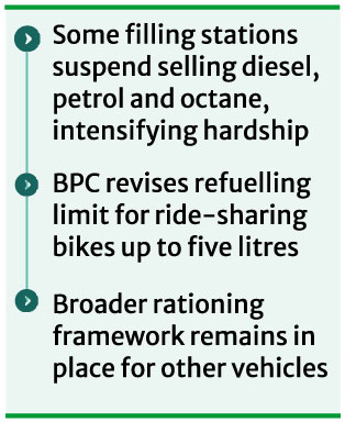Amid the rush at pumps, the state-run Bangladesh Petroleum Corporation (BPC) on Tuesday revised the daily refuelling limit for ride-sharing motorcycles in metropolitan areas, raising it to five litres.