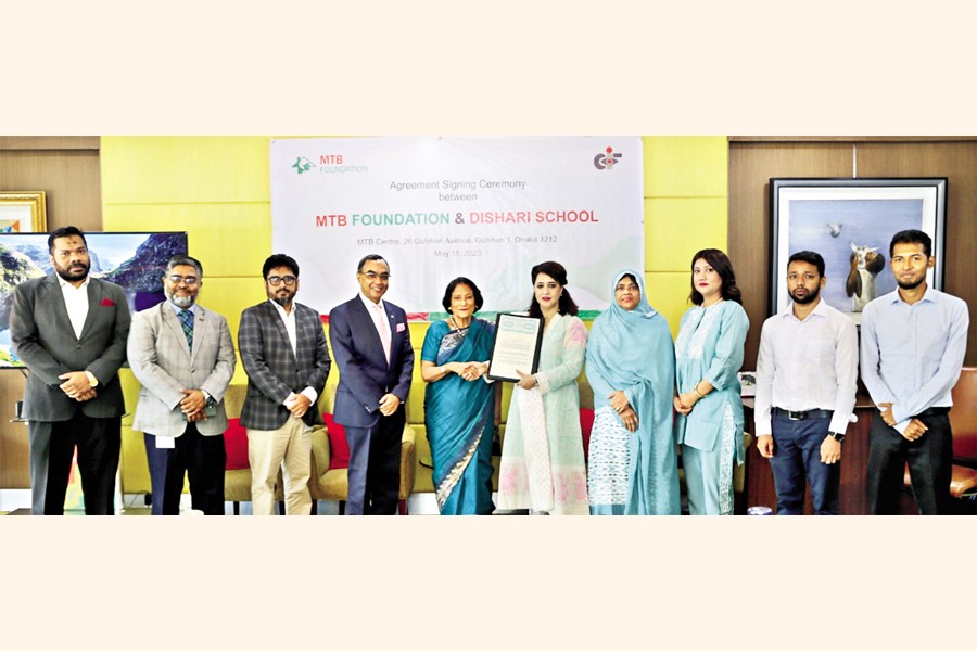 MTB Foundation recently signed an agreement with Dishari School for a project titled, 'Providing Financial Support to the Children of Poor Working Mothers at Dishari School'. The agreement was signed by Salma Masud, executive director, Dishari School, and Samia Chowdhury, chief executive officer, MTB Foundation, in presence of Syed Mahbubur Rahman, managing director and CEO, at a ceremony held at the bank's corporate head office in the capital's Gulshan area. Under this project, MTB Foundation will provide financial support to the school for the education of the children of poor working mothers.