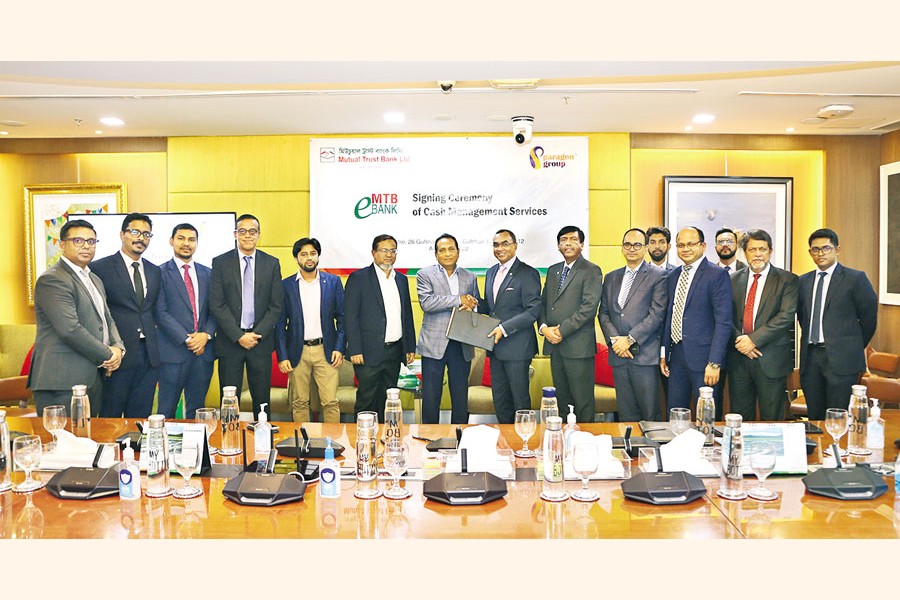 Mutual Trust Bank Limited (MTB) and Paragon Group have signed an agreement for cash management services recently. The photo shows Syed Mahbubur Rahman, Managing Director & CEO of MTB, and Moshiur Rahman, Chairman & Managing Director of Paragon Group, exchanging documents after signing the agreement at a simple ceremony held at the MTB Centre at Gulshan in the city.