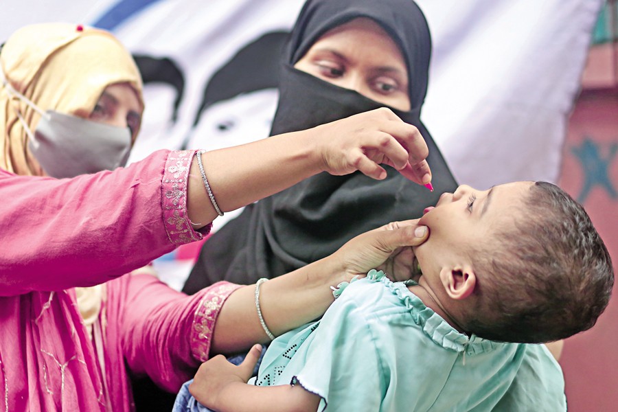 A health official administers Vitamin A capsule to a child during the "National Vitamin 'A' Plus Campaign-2023" at a centre in Dhaka's Shantibagh area on Sunday. — FE photo by KAZ Sumon