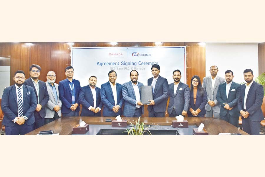 NCC Bank recently signed a memorandum of understanding (MoU) with Ramada by Wyndham Cox's Bazar to offer the bank's cardholders and employees exclusive privileges and attractive discounts at the hospitality destination. In presence of M. Khurshed Alam, additional managing director of NCC Bank, the MoU documents were formally exchanged between Md. Zakir Anam, deputy managing director of the bank, and Khaled Bin Ahmad, chief operation officer of Ramada by Wyndham.
