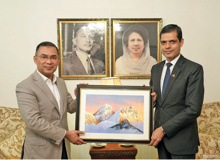 Nepal's Ambassador to Bangladesh, Ghanashyam Bhandari, presents a picture featuring 'Mount Everest' to BNP Chairman Tarique Rahman during a courtesy meeting at the latter's Gulshan office in the capital on Saturday. — — Focus Bangla