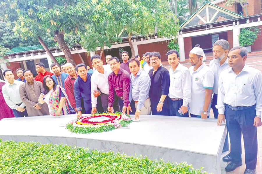 Newly promoted 13 general managers of Rupali Bank Limited paid homage to Father of the Nation Bangabandhu Sheikh Mujibur Rahman by placing a wreath at his mausoleum in Tungipara recently. They are GM Mohammad Safayet Hossain, Kamal Bhattacharjee, Md. Moinuddin Masud, Taj Uddin Ahamed, Mohammad Ameer Hossain, Abdullah Al Mahmud, Md. Noman Mia, Salamun Nessa, Tanvir Hasnain Moin, Abu Naser Mohammed Masud, Rokonuzzaman, Md. Abul Hasan and S.M. Didarul Islam.
