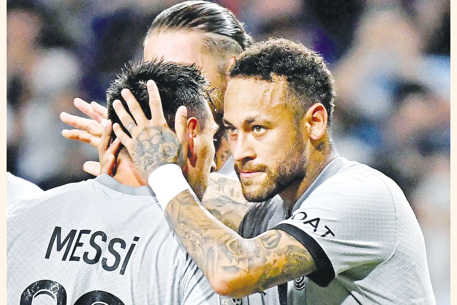 Paris Saint-Germain's Brazilian forward Neymar (R) celbrating his goal with teammate Argentinian forward Lionel Messi (L) during PSG's Japan Tour football match against Gamba Osaka at Suita stadium in Osaka on Monday — AFP