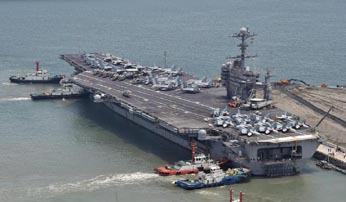 North Korea on Saturday condemned a port visit by a US aircraft carrier to the South as a ‘reckless’ act of provocation following proposals by Pyongyang to ease cross-border tensions. The USS George Washington arrived in the southern port of Busan on Friday for joint military exercises starting next week. A spokesman of the Policy Department of the North's National Defence Commission (NDC) said the visit was “little short of its 'gunboat diplomacy' in the last century” and ‘in defiance’ of the North's overtures.’ The US should properly understand that the more persistently it resorts to reckless nuclear blackmail and threat, the further the DPRK (North Korea) will bolster up its cutting edge nuclear force for self-defence’, the spokesman was quoted as saying by the North's official Korean Central News Agency (KCNA). He said the exercises, taking place after the North reached out last week, were an ‘open challenge’ to its efforts. ‘Whenever there was a sign of improving the north-south relations and detente on the peninsula, the US resorted to sinister interference and obstructions’, he said in reference to the upcoming drills. The George Washington is scheduled to take part in joint exercises with the South Korean navy from July 16-21 as part of annual military drills, Seoul's Yonhap news agency said. It will then participate in a search and rescue exercise with South Korean and Japanese maritime forces in waters off the southern island of Jeju for two days starting July 21, it said. Last week the NDC called for both the North and the South to halt all hostile military activities -- a suggestion Seoul dismissed as ‘nonsensical’ in the light of Pyongyang's nuclear weapons programme. North Korea issued another call Monday for a lowering of military tensions with South Korea, even as leader Kim Jong-Un oversaw firing drills on an island near the sensitive maritime border. A government statement carried by KCNA said it was time to end ‘reckless hostility and confrontation’ and called on Seoul to scrap its annual joint military drills with the United States. South Korea has repeatedly made it clear that the annual joint drills are non-negotiable, according to Yahoo News.
