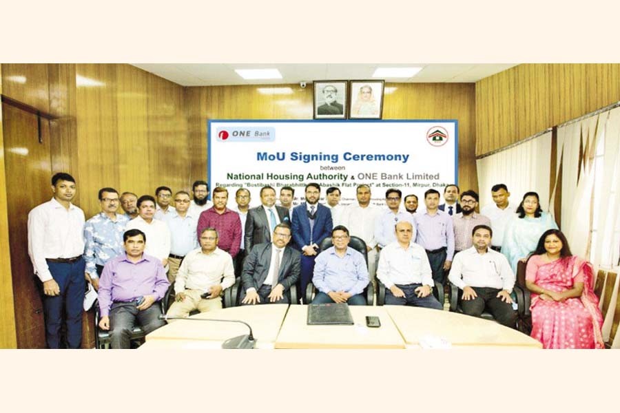 ONE Bank Limited signed an MoU with National Housing Authority at Grihayan Bhaban, Dhaka recently. Secretary of National Housing Authority Mohammad Ullah and Managing Director of ONE Bank Limited Monzur Mofiz signed the MoU on behalf of their respective organisations. Chairman of National Housing Authority Md. Delwar Haidar was present in the ceremony.