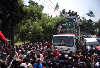 Thousands of protesters set off from the Pakistani city of Lahore on Thursday to march on the capital in a bid to unseat the government they claim was elected by fraud. Supporters of cricketer-turned-politician Imran Khan and populist preacher Tahir-ul-Qadri massed separately in Lahore before beginning the 300-kilometre (190-mile) journey to rally in Islamabad. Both Khan and Qadri say the May 2013 general election was rigged and want Prime Minister Nawaz Sharif to resign and hold new polls. Sharif won by a landslide. The two groups, travelling in motorised convoy up the Grand Trunk Road to Islamabad on the anniversary of Pakistan's independence from Britain, were not expected to reach the capital before late in the evening. The authorities had insisted Qadri's Pakistan Awami Tehreek (PAT) march would not be allowed before relenting in the afternoon. ‘The government has allowed PAT to march towards Islamabad on condition that they remain peaceful, no armed person joins the march and no participant of the march breaks any law,’ a senior police official in Lahore said, according to AFP.