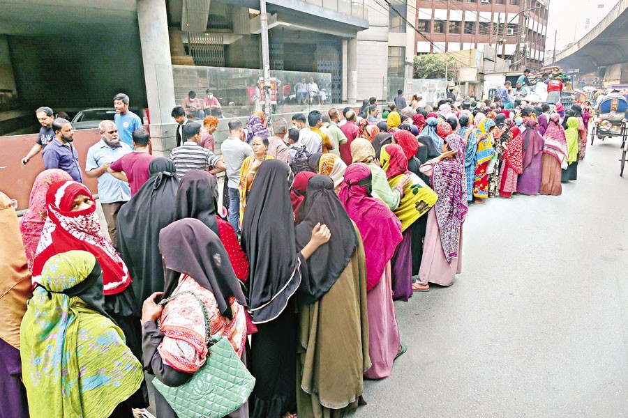 People form long queues to buy essentials from a TCB truck selling daily commodities at subsidised prices in the capital's Wari area on Monday. -- FE Photo by Shafiqul Alam