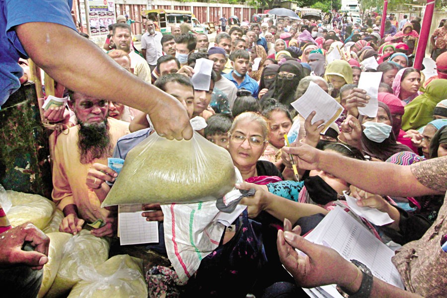 People swarm a government-run sales point to buy rice at a subsidised rate in Azimpur area of Dhaka on Thursday. The government launched its Food-friendly Programme and started selling rice at Tk 30 per kg under the open market sale for low-income people on the day — FE photo