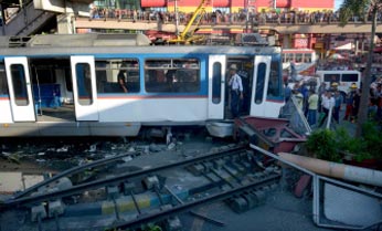 A Philippine commuter train rammed through a concrete barrier and rolled into a busy intersection on Wednesday, injuring scores of passengers and damaging vehicles, officials said. Rescuers removed injured passengers from the front car of the train and took them to a hospital after the accident in Pasay city in metropolitan Manila. There were no immediate reports of any deaths from the accident, which created a huge traffic jam. Senior Superintendent Florencio Ortilla, who heads the Pasay city police, said the train toppled concrete posts, spraying debris and damaging cars in the crowded intersection. Hernando Cabrera, spokesman of the agency that operates the train system, said the train had a ‘technical problem’ and was being pushed by another when it became detached and rolled into the concrete barrier at the final station on the line, according to AP.