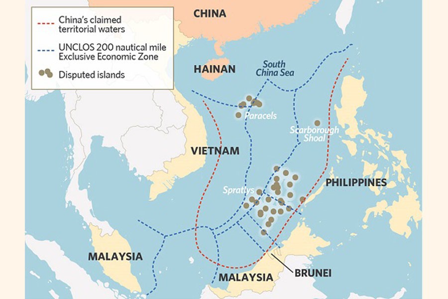 China's U-shaped line loops as far as 1,500 km (932 miles) south of its Hainan island and cuts into the exclusive economic zones (EEZs) of Vietnam, the Philippines, Malaysia, Brunei and Indonesia.