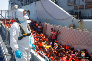 Photo: AT SEA : Rescuers of the Italian Navy and refugees on a boat