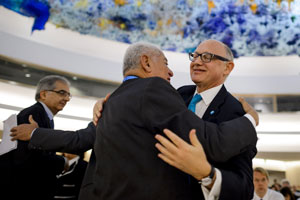 Photo: GENEVA: Argentinian Foreign Minister Hector Timerman (R) reacts