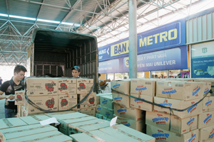 Photo: HANOI: Men unloads boxes of fruits to a Metro supermarket