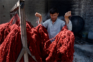 Photo: KABUL, Afghanistan: An Afghan worker dyes thread at a carpet manufacturer