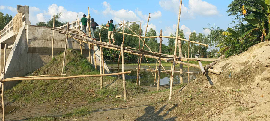 Photo shows children using the bamboo bridge as there are no connecting roads on either side of the bridge over Itapota canal in Sadar upazila of Lalmonirhat district — UNB