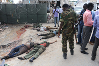 Photo: SOMALIA : A soldier looks at the bodies of six alleged Shebab rebels