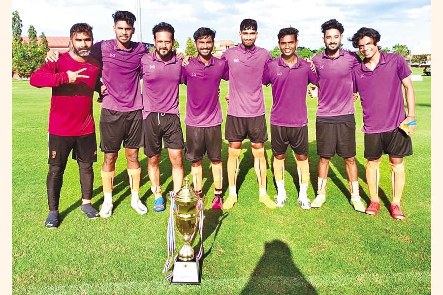 Players of Royal Oranje FC, a specialised 7-a side football club of the country, posing with the trophy after winning the Hua Hin 7's International Club Cup tournament in Thailand. The 7-a side international football tournament supported by Thai Football Association, was organised by Vikings Club. SIM Group & Rupayan Design Studio Ltd were the sponsors of the journey of team Royal Oranje.