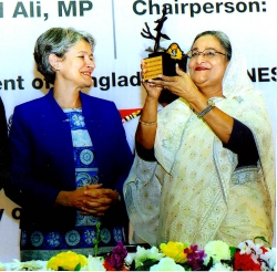 Prime Minister Sheikh Hasina Monday received a special memento from UNESCO in recognition of her outstanding contribution to promotion of girls' and women's education. UNESCO Director General Irina Bokova presented the memento titled "Tree of Peace" to the Prime Minister at Bangabandhu International Conference Centre in Dhaka on the occasion of the International Literacy Day 2014. Receiving the memento, Sheikh Hasina dedicated it to all women and children of the country, according to a news agency.