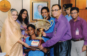 The Prime Minister later handed over a check for Tk 0.1 million each to all officials and players of the team. Players and officials of the team handed over the trophy that they won in India to the Prime Minister.